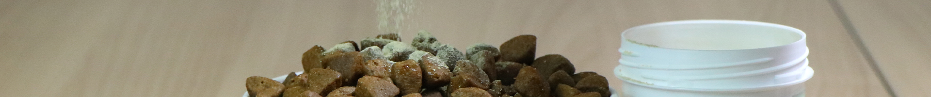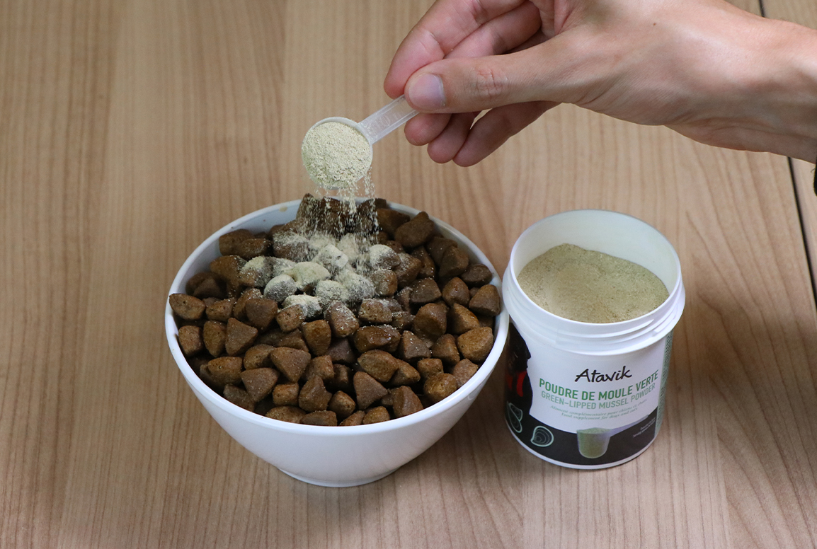 Les poudres (krill, moule verte, levure de bière) se mélangent parfaitement à la ration humide ou aux croquettes légèrement réhydratées.